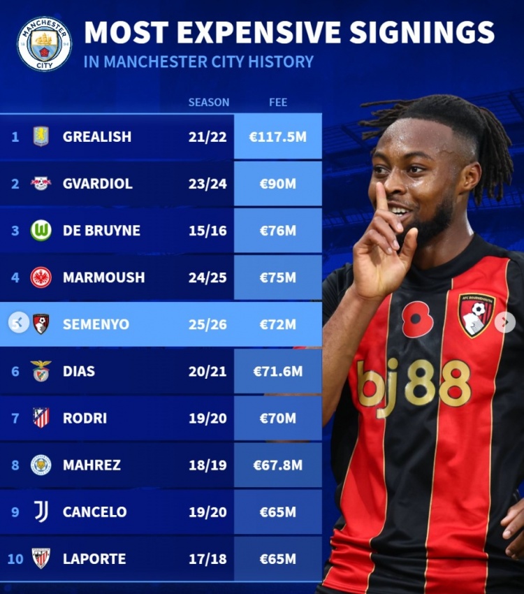 1月9日讯 曼城已经官宣签下伯恩茅斯边锋塞梅尼奥,据悉转会费7200万欧元,《转会市场》统计显示他也是队史第5贵引援。